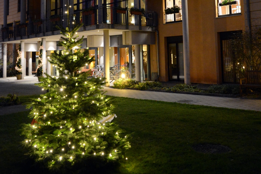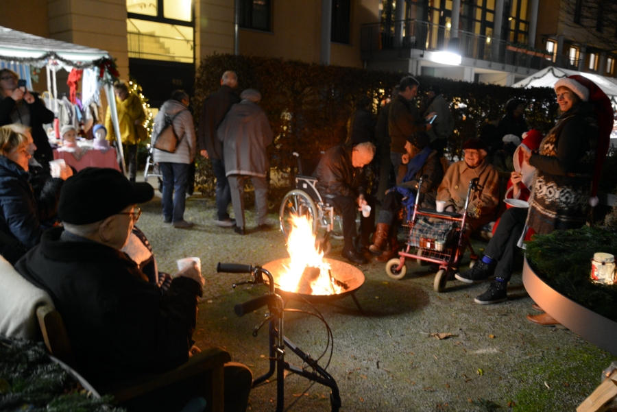Am 29. November, dem Freitag vor dem 1. Advent, hatte in der Stavangerstraße 26 wieder der Seniorenweihnachtsmarkt geöffnet. Das Wetter war kühl, aber der Regen hielt sich weitgehend zurück, so dass zahlreiche Besucher sowohl die Stände im Freien als auch die warmen Plätze im festlich geschmückten Foyer aufsuchten. Begehrt waren insbesondere die Plätze an der wärmenden Feuerschale im Garten. Seniorinnen und Senioren, ihre Angehörigen und Gäste ließen sich Bratwurst und Glühwein, frisch zubereitete Waffeln oder selbstgemachte Schmalzbrote schmecken. Wer wollte, konnte sich die Zukunft aus den Karten lesen lassen.